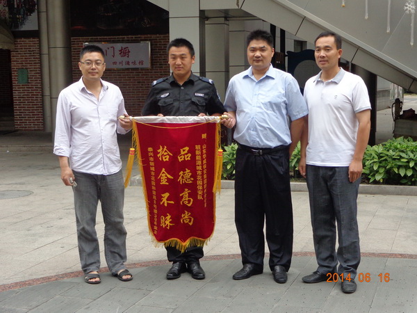 6月15日12點(diǎn)左右,華威保安揚(yáng)州保安公司美食廣場(chǎng)項(xiàng)目部保安主管路標(biāo)巡邏到廣場(chǎng)內(nèi)街時(shí),發(fā)現(xiàn)凳子上有一個(gè)包,他左右看了看沒(méi)有人,又等了近半個(gè)小時(shí),還是不見(jiàn)有人來(lái)取,他打開(kāi)粗略一看,發(fā)現(xiàn)里面有現(xiàn)金,手機(jī)等貴重物品,他感到事情重大,及時(shí)撥打了110,并通知了物業(yè)馬經(jīng)理和管理部馬主任,等他們趕到后,當(dāng)場(chǎng)清點(diǎn)了里面的物品:現(xiàn)金6700余元,各種卡類(lèi)15張,三星手機(jī)兩部。經(jīng)物業(yè)管理處多方查找得知,該失主是小區(qū)業(yè)主后,立即電話通知失主。當(dāng)問(wèn)他是否丟過(guò)東西時(shí),他卻不知道丟失物品,再次讓他們確認(rèn)時(shí),他老婆才恍然大悟說(shuō):“錢(qián)包丟了”。隨即趕到美食廣場(chǎng),查看里面的東西全部都在,激動(dòng)地說(shuō):“太謝謝保安同志了,要不是你們及時(shí)發(fā)現(xiàn),我的錢(qián)可能就保不住了,特別是里面的卡”。隨即拿出錢(qián)來(lái)表示感謝,被路標(biāo)謝絕了,并說(shuō):“這是我們應(yīng)該做的”。